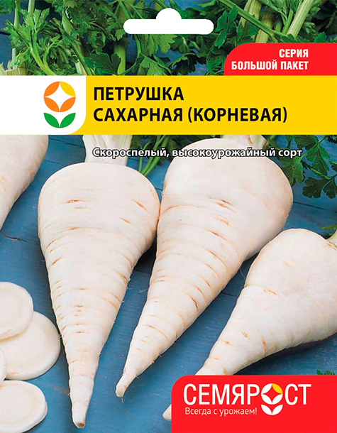 Раннеспелый , высокоурожайный сорт. Двухлетнее пряновкусовое растение. Розетка раскидистая, число листьев 20-40. Черешки светло-зеленые, длиной 20-28 см. Корнеплод конический до 22 см в длину и около 5 см в диаметре.Окраска поверхности серовато-белая, мякоть белая со светло-желтой сердцевиной. Холодостойкая, хорошо зимует в открытом грунте без укрытия. Содержит много витамина С, каротина, солей, кальция. У корневой петрушки используется зелень и крупный вкусный корень.