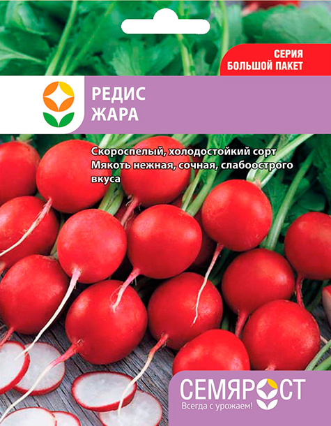Ранний скороспелый сорт. Корнеплод имеет круглую форму, ярко-красного, малинового цвета, кожа гладкая, вес в пределах от 17 до 27 г. Мякоть сочная, с приятным слабоострым вкусом, плотная, белого или бело-розового цвета. Редис этого сорта содержит в большом количестве витамин С. Отличительной чертой сорта является жаростойкость, устойчивость к цветушности и болезням. Употребляют как в свежем виде, так и в салатах.