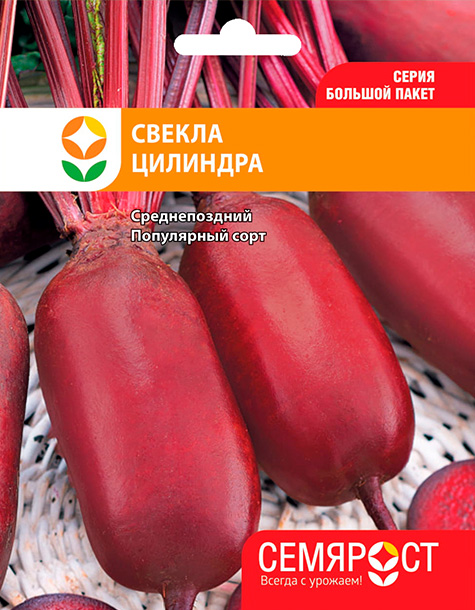 Свекла Цилиндра – Среднепоздний популярный сорт. Период от всходов до уборки урожая 130 дней. Корнеплод имеет удлиненно-цилиндрическую форму с заостренным концом и достигает 17 см в длину и 6 см в диаметре. Головка корнеплода среднего размера, приплюснутая, немного выступает над поверхностью почвы. Мякоть очень темная, сочная, без кольцеватости. Данный сорт хорошо сохраняется на протяжении длительного времени и отличается высокой урожайностью. Благодаря своим вкусовым качествам очень широко используется в кулинарии для добавления в различные блюда.
